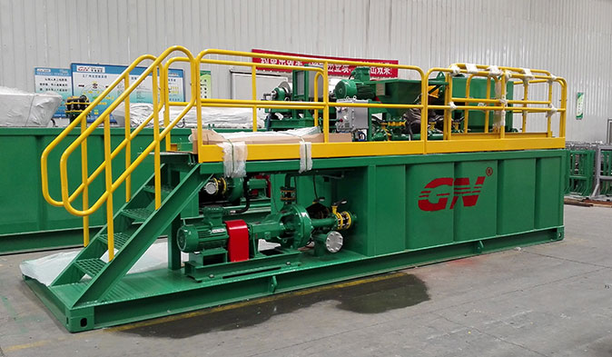 本套系統(tǒng)分為2個階段的固控處理和一套泥漿配置混合系統(tǒng)。鉆井泥漿初步分離采用的是冠能GNZS752型振動篩,200GPM的處理能力、兩片篩網(wǎng)的構(gòu)造用來處理鉆井泥漿中的大顆粒的固體。振動篩處理后的液體通過離心泵輸送給迷你型的沉降離心機GNLW223進一步處理,可達3800RPM的轉(zhuǎn)速,分離的固體顆??蛇_到2個微米。
