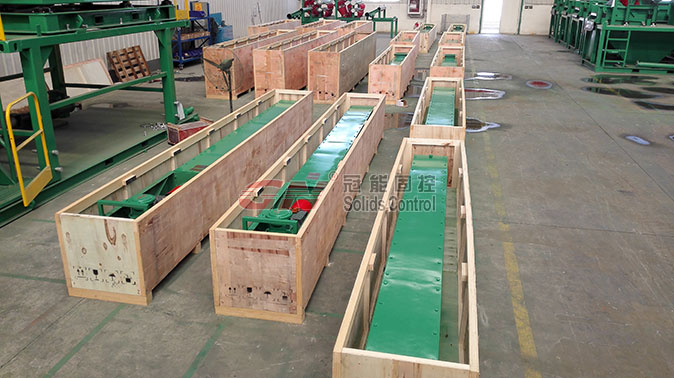 2、配備12臺螺旋輸送器,用于振動篩,泥漿清潔器、離心機等固控設備處理后排出的鉆屑,并提供給鉆屑甩干機。冠能公司生產的螺旋推料器U型槽增加了框架支撐,電機和齒輪箱也有鋼框架的保護。螺旋材料采用16Mn,具有更好的耐磨性,螺旋設計12英尺為一節(jié),方便現(xiàn)場安裝及運輸。