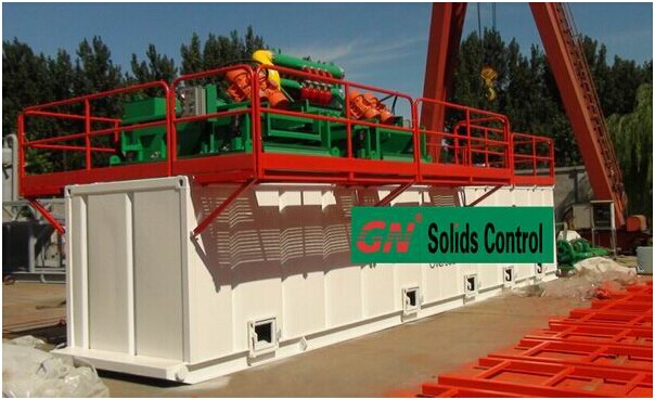 冠能150GPM泥漿系統(tǒng)配置如下 1、1臺(tái)GNZS703D雙層振動(dòng)篩上安裝了3個(gè)4寸除泥旋流器,通過(guò)GNZS703D雙層篩可以把粗砂除去,然后通過(guò)除泥旋流器把20um左右以上的顆粒在分離除去, 2、2臺(tái)GNSB4X3-12J的砂泵安裝在泥漿罐斜倉(cāng)上,1臺(tái)用于給除泥器供漿,另外1臺(tái)作為混漿泵使用。 3、4米長(zhǎng)的泥漿罐,非常緊湊的設(shè)計(jì)跟合理的布局,對(duì)于狹小的鉆井空間非常適宜。
